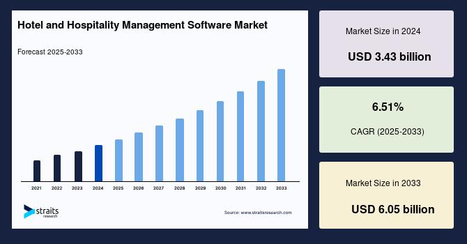 According to StraitsResearch, the global hotel and hospitality management software market size was estimated at USD 3.43 billion in 2024 and is anticipated to grow from USD 3.65 billion in 2025 till USD 6.05 billion in 2033, growing at a CAGR of 6.51% from 2025 to 2033.