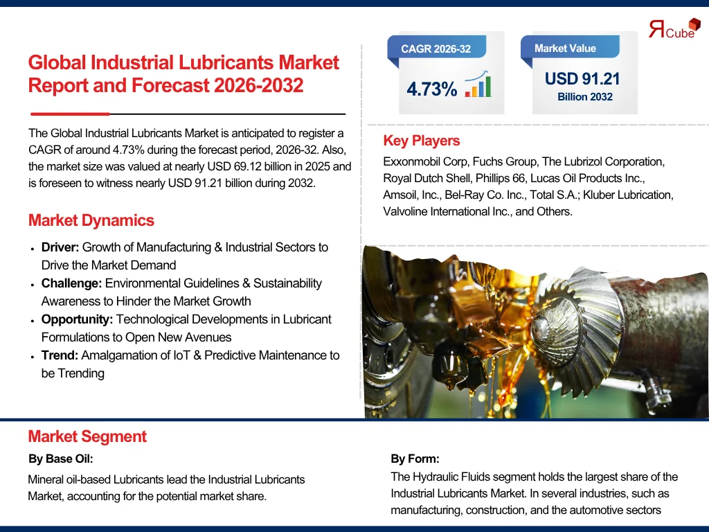 The Report Cube which is one of the leading market research company in UAE expects the Global Industrial Lubricants Market to grow at a CAGR of around 4.73% through 2032, as highlighted in their latest research report. The study provides an in-depth analysis of the emerging trends shaping the Global Industrial Lubricants Market and offers detailed forecasts for its potential growth during 2025–2032. The report also presents a comprehensive assessment of the competitive landscape, including profiles of leading players, their performance metrics, and recent strategic developments. Additionally, it explores the key market drivers, challenges, opportunities, and provides insights into historical and future revenue trends at the global, regional, and country levels.