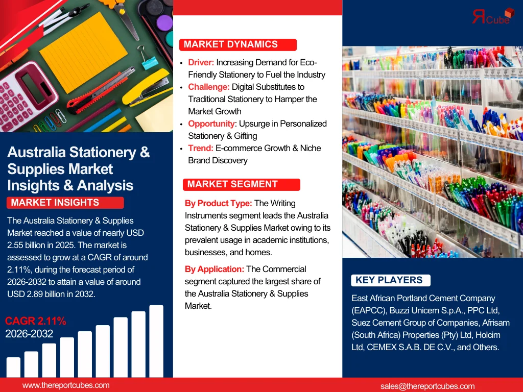 The Australia Stationery & Supplies Market reached a value of nearly USD 2.55 billion in 2025. The market is assessed to grow at a CAGR of around 2.11%, during the forecast period of 2026-2032 to attain a value of around USD 2.89 billion in 2032.