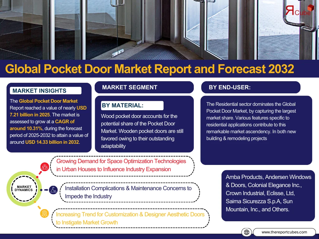 The Global Pocket Door Market Report reached a value of nearly USD 7.21 billion in 2025. The market is assessed to grow at a CAGR of around 10.31%, during the forecast period of 2025-2032 to attain a value of around USD 14.33 billion in 2032.