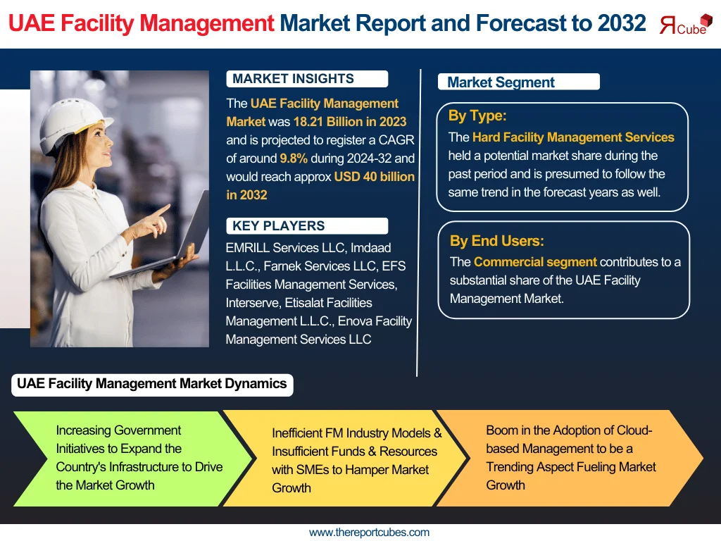 The UAE Facility Management Market was 18.21 Billion in 2023 and is projected to register a CAGR of around 9.8% during the forecast period, i.e., 2024-32 and would reach approx USD 40 billion in 2032.