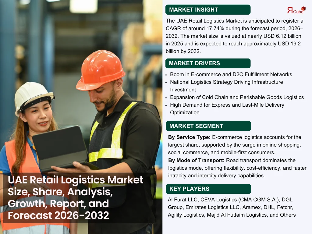 The UAE Retail Logistics Market is anticipated to register a CAGR of around 17.74% during the forecast period, 2026–2032. The market size is valued at nearly USD 6.12 billion in 2025 and is expected to reach approximately USD 19.2 billion by 2032.