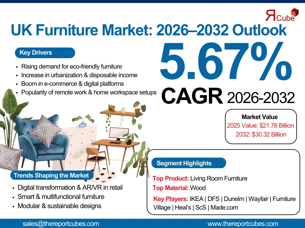 The UK Furniture Market is anticipated to register a CAGR of around 5.67% during the forecast period, 2026-32. Also, the market size was valued at nearly USD 21.78 billion in 2025 and is foreseen to witness nearly USD 30.32 billion during 2032.