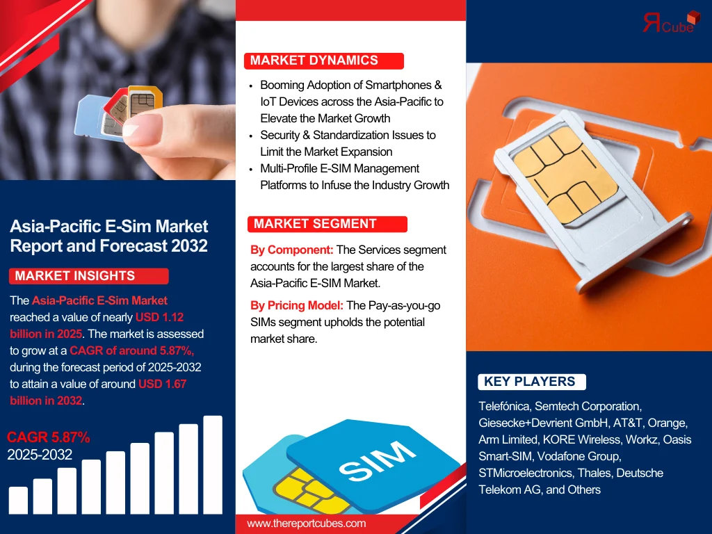 The Asia-Pacific E-Sim Market reached a value of nearly USD 1.12 billion in 2025. The market is assessed to grow at a CAGR of around 5.87%, during the forecast period of 2025-2032 to attain a value of around USD 1.67 billion in 2032.