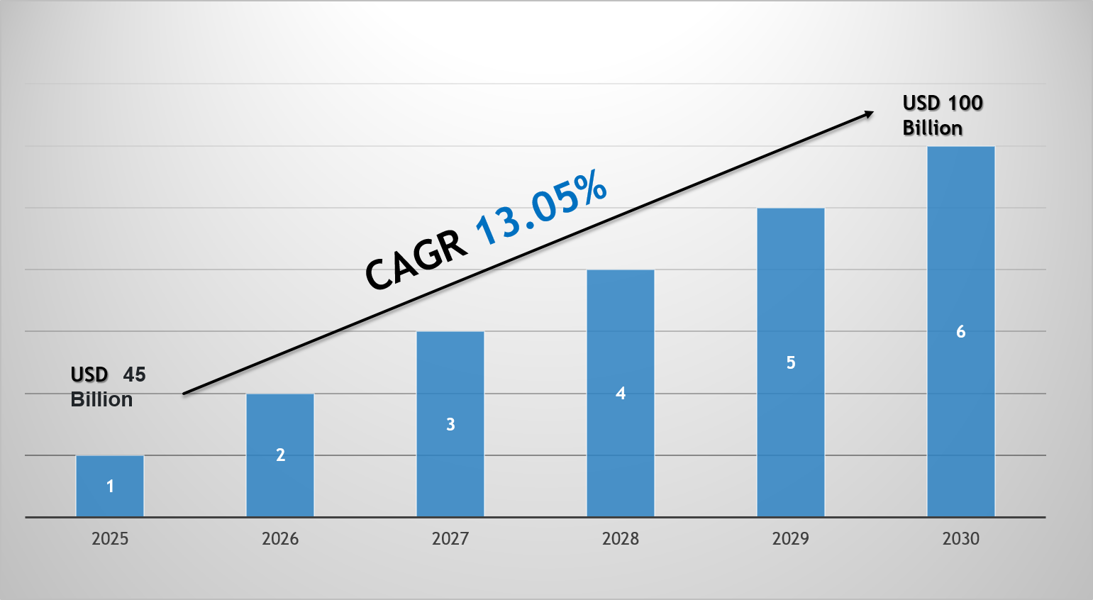 The India Semiconductor Market size is valued at around USD 45 billion in 2025 and is projected to reach USD 100 billion by 2030. Along with this, the market is estimated to grow at a CAGR of around 13.05% during the forecast period, i.e., 2025-30. The India Semiconductor Market is often perceived to be on an unprecedented growth path, driven by the rising Indian EV semiconductor demand, government initiatives, technological acceleration, and domestic chip manufacturing in India. The government's PLI Scheme, pressed into existence for the promotion of local manufacturing of semiconductors, has been a major impetus. This initiative aims to reduce India's dependence on semiconductor imports, with the government committing substantial financial support to attract investments in fabrication plants and R&D. A key part of this effort is India’s chip design and production initiatives, where global and domestic firms are investing in chip design, R&D, and integrated production capabilities. This has resulted in high exports from India. For instance, the semiconductor exports from India (2025) are projected to generate more than USD20 billion.