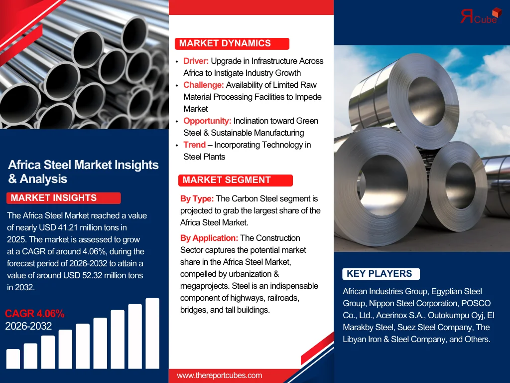 The Report Cube which is one of the leading market research company in UAE expects the Africa Steel Market to grow at a CAGR of around 4. 06%through 2032, as highlighted in their latest research report. The study provides an in-depth analysis of the emerging trends shaping the Africa Steel Market and offers detailed forecasts for its potential growth during 2026–2032. The report also presents a comprehensive assessment of the competitive landscape, including profiles of leading players, their performance metrics, and recent strategic developments. Additionally, it explores the key market drivers, challenges, opportunities, and provides insights into historical and future revenue trends at the global, regional, and country levels.