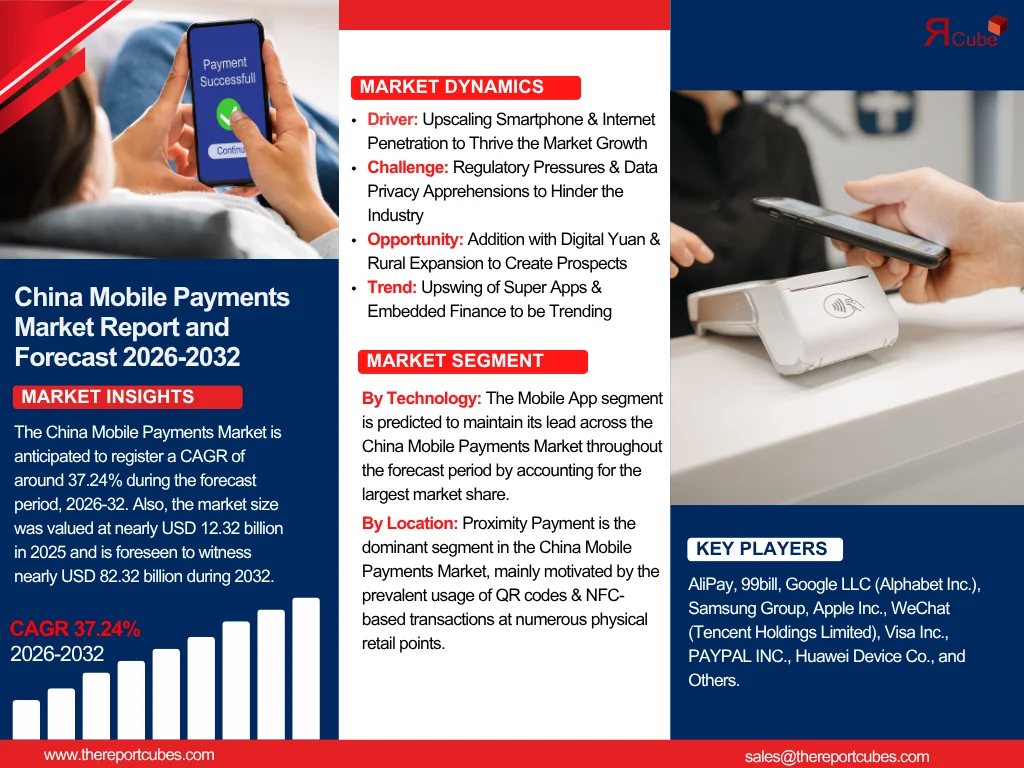 The Report Cube which is one of the leading market research company in UAE expects the China Mobile Payments Market to grow at a CAGR of around 37.24% through 2032, as highlighted in their latest research report. The study provides an in-depth analysis of the emerging trends shaping the China Mobile Payments Market and offers detailed forecasts for its potential growth during 2026–2032. The report also presents a comprehensive assessment of the competitive landscape, including profiles of leading players, their performance metrics, and recent strategic developments. Additionally, it explores the key market drivers, challenges, opportunities, and provides insights into historical and future revenue trends at the global, regional, and country levels.