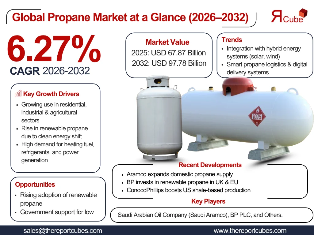 The Report Cube which is one of the leading market research company in UAE expects the Propane Market to grow at a CAGR of around 6.27% through 2032, as highlighted in their latest research report. The study provides an in-depth analysis of the emerging trends shaping the Propane Market and offers detailed forecasts for its potential growth during 2026–2032. The report also presents a comprehensive assessment of the competitive landscape, including profiles of leading players, their performance metrics, and recent strategic developments. Additionally, it explores the key market drivers, challenges, opportunities, and provides insights into historical and future revenue trends at the global, regional, and country levels.