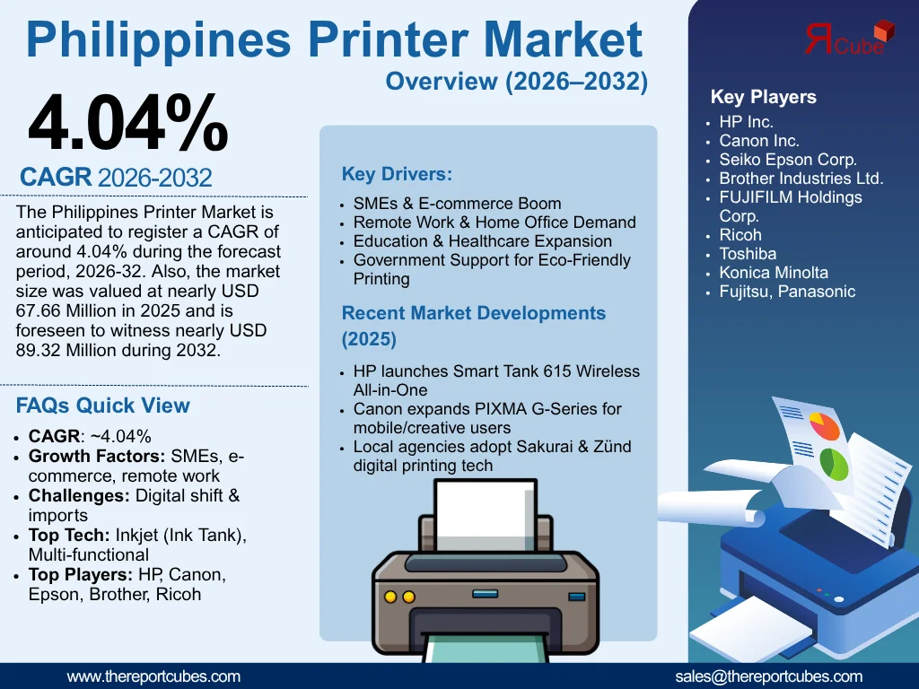 The Report Cube which is one of the leading market research company in UAE expects the Philippines Printer Market to grow at a CAGR of around 4.04% through 2032, as highlighted in their latest research report. The study provides an in-depth analysis of the emerging trends shaping the Philippines Printer Market and offers detailed forecasts for its potential growth during 2025–2032. The report also presents a comprehensive assessment of the competitive landscape, including profiles of leading players, their performance metrics, and recent strategic developments. Additionally, it explores the key market drivers, challenges, opportunities, and provides insights into historical and future revenue trends at the global, regional, and country levels.