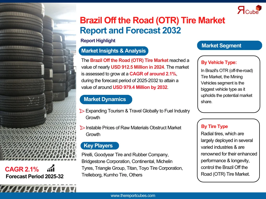 The Report Cube which is one of the leading market research company in UAE expects the Brazil Off the Road (OTR) Tire Market to grow at a CAGR of around 2.1% through 2032, as highlighted in their latest research report. The study provides an in-depth analysis of the emerging trends shaping the Brazil Off the Road (OTR) Tire Market and offers detailed forecasts for its potential growth during 2025–2032. The report also presents a comprehensive assessment of the competitive landscape, including profiles of leading players, their performance metrics, and recent strategic developments. Additionally, it explores the key market drivers, challenges, opportunities, and provides insights into historical and future revenue trends at the global, regional, and country levels.